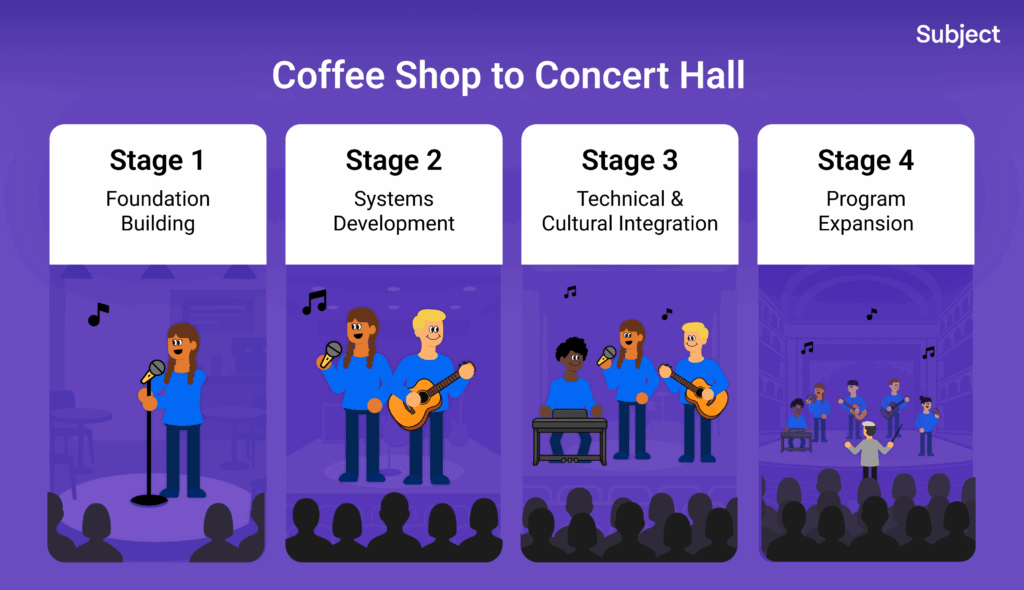 That’s because individual instruments (students) become more powerful when they harmonize with others. When you break out his process into four stages, it’s clear how to create peer learning systems that strengthen as programs expand.