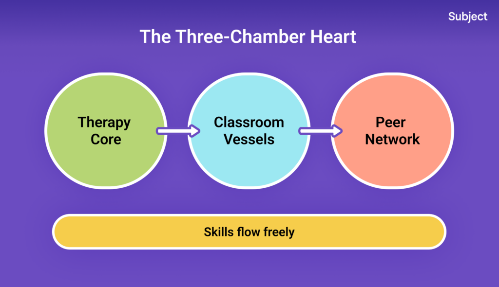 Traditional therapy operates like organs isolated for individual study. Speech happens in one room, academics in another, social skills in a third. Nothing connects.
